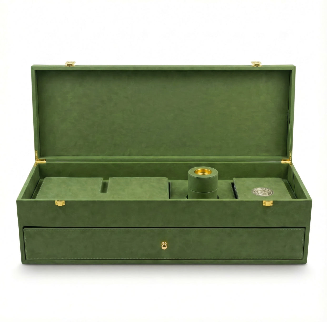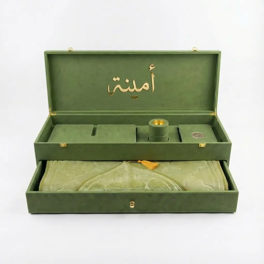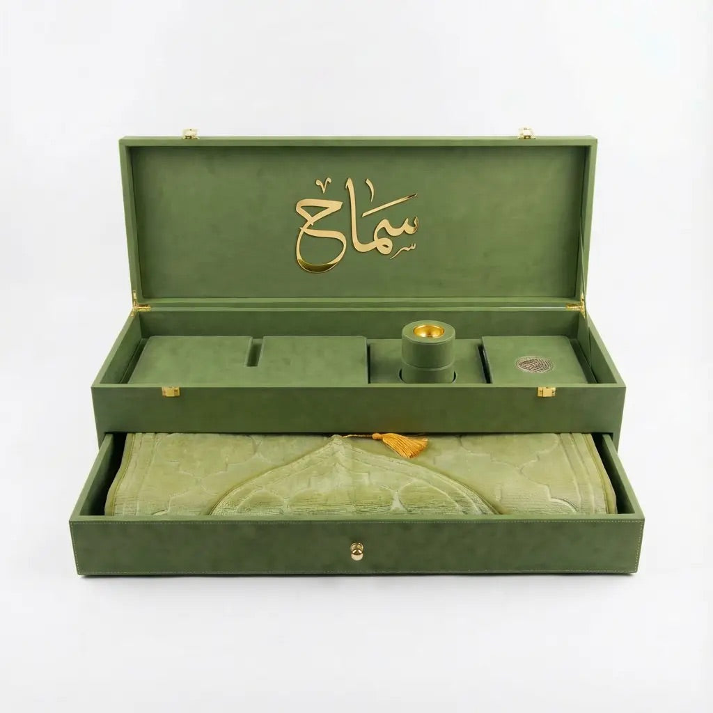 يتكون صندوق سجادة الصلاة الفاخر هذا المصنوع من الجلد من: مصحف مقدس مغلف بالجلد، وحامل مصحف خشبي مغلف بالجلد، ومبخر مغلف بالجلد، وسجادة صلاة أنيقة للغاية.